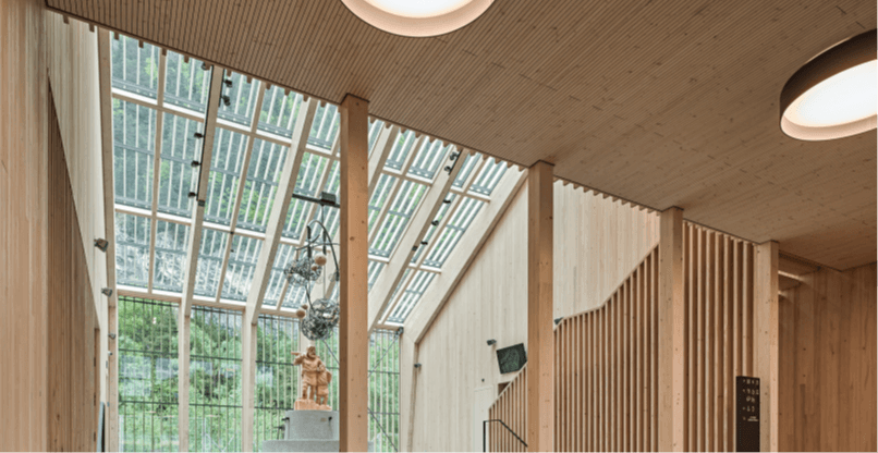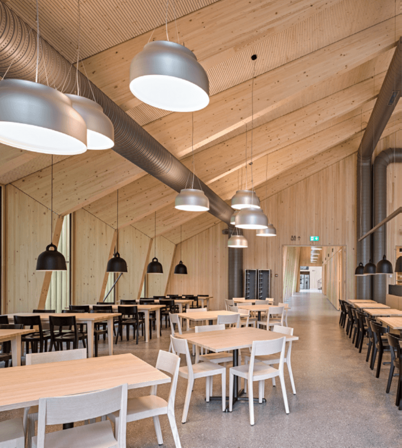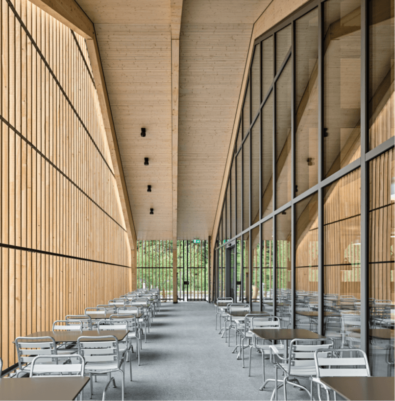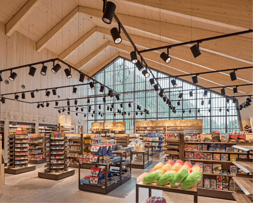 Die Decken der 2018 eröffneten neuen Gotthard Raststätte in Fahrtrichtung Tessin sind mit Diotrol Aqua Sun-Ex Finish One, Natura gestrichen worden.